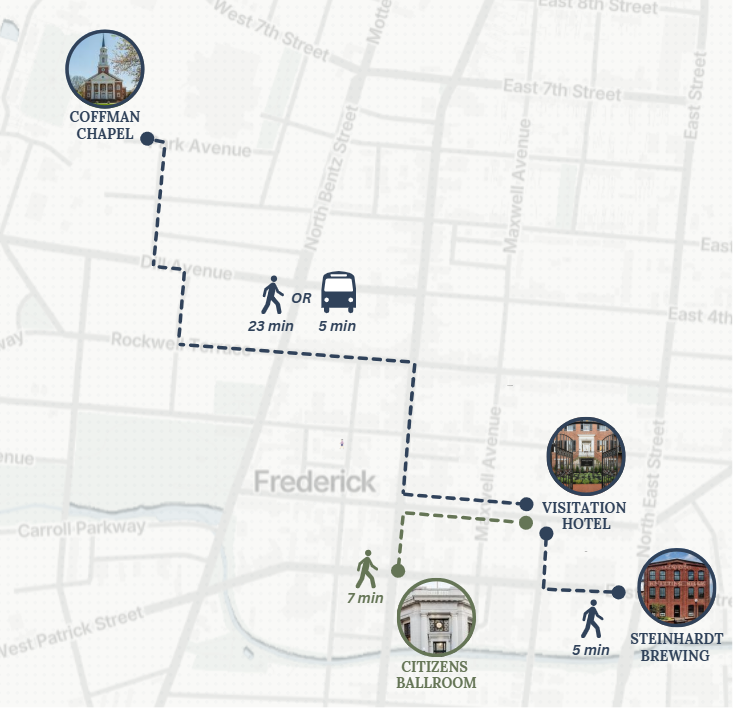 Guests are welcome to either walk or take provided transportation to the ceremony. Coffman Chapel is approximately a 20-minute walk from the Visitation Hotel. Shuttles will depart from Visitation at 1:45 pm and 2:05 pm, with return service available after the ceremony.
